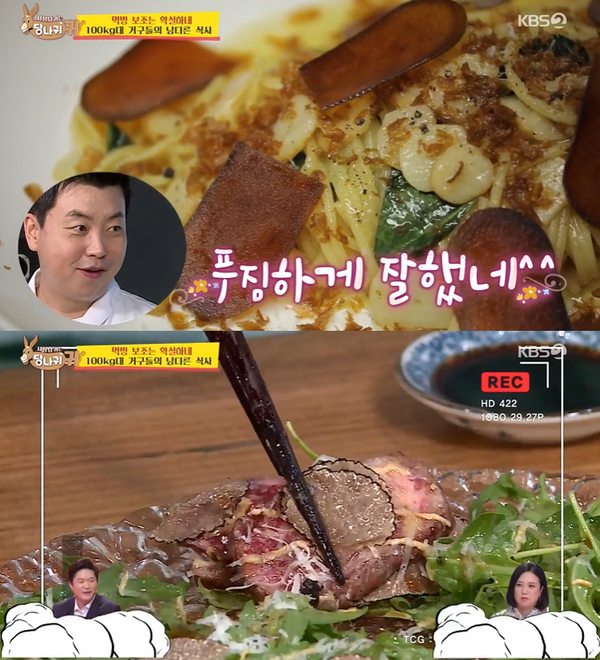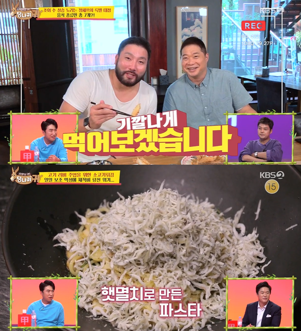 현주엽과 박광재는 은갈치 튀김과 모듬회로 먹방을 시작했습니다. 이후 정호영 가게 시그니처 메뉴인 칼슘 파스타가 등장했습니다. 정호영은 “기존 파스타는 서양식 육수베이스다. 저희는 특제 우동 육수를 사용했다”고 자부심을 드러냈습니다. 맛을 본 현주엽은 “맛있다”라며 손에서 그릇을 놓지 못했는데요.