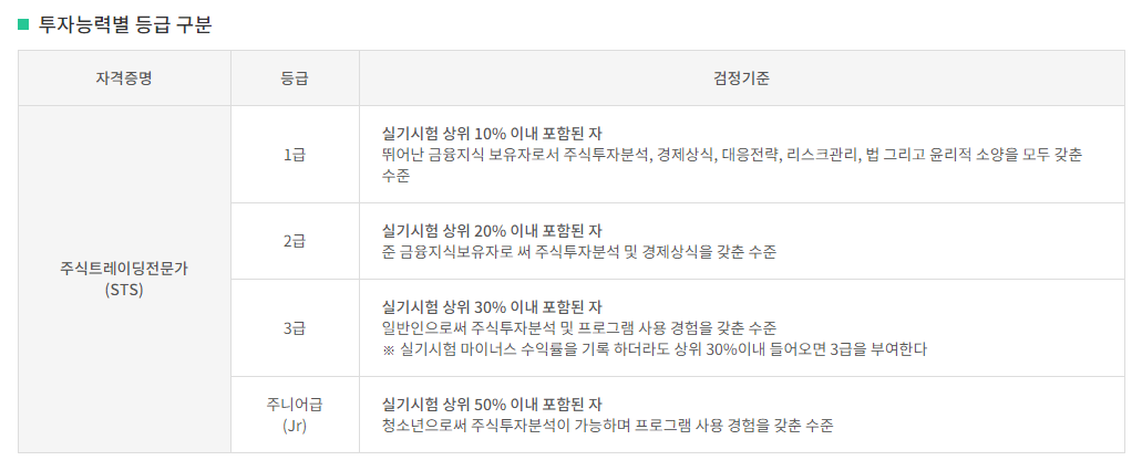 주식트레이딩 전문가 등급은 1,2,3급 그리고 주니어급으로 나눠집니다.