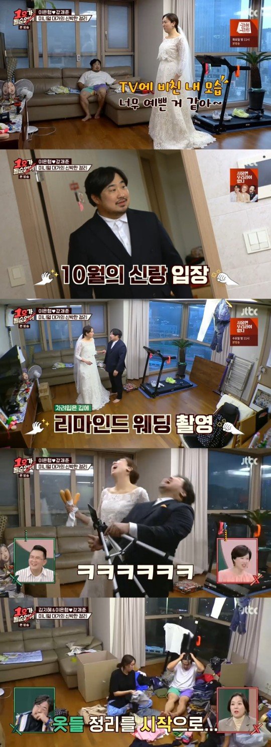 이날 이은형은 집 정리 도중 웨딩드레스를 꺼내 입었습니다. 이에 강재준과 턱시도를 갈아 입으며 신혼 분위기를 뽐냈습니다. 턱시도를 입은 강재준 모습에 이은형은 입을 다물지 못했는데요.