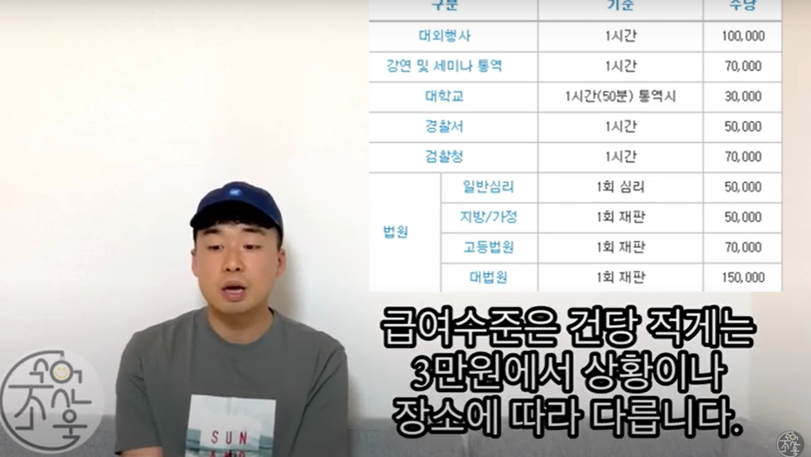 급여수준은 건당 적게는 3만원, 상황이나 장소에 따라 다르며, 방송의 경우 30만원으로 책정 된 것을 볼 수 있습니다. 즉, 통역사 역량에 따라 천차만별이 될 수 있습니다. 청각작이앤이 개인적인 업무로 소화통역사를 부를 때 비용이 일체 발생하지 않으며, 지 자체에서 수화통역센터에 급여를 줍니다.