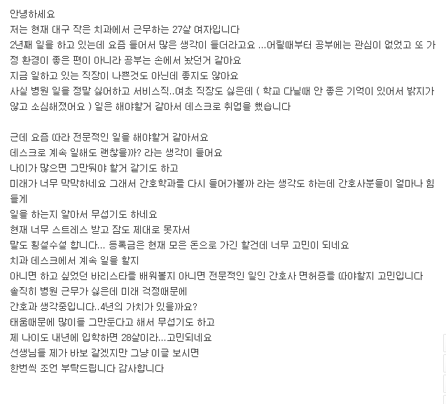 한 커뮤니티에 올라온 취업에 대한 고민상담 글입니다. 미래를 걱정하는 글쓴이의 고민이 현재 취업준비생들의 고민과 다르지 않은 것 같습니다. 병원에는 다양한 종류의 직업이 존재합니다.