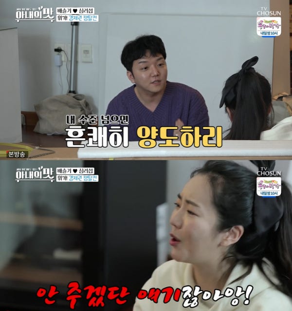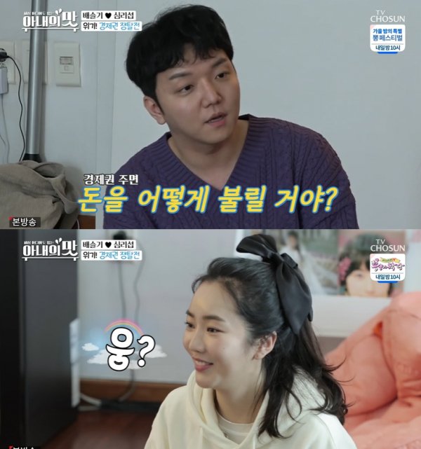 심리섭은 “재테크 지식이랑 능력이 나보다 월등하게 높다는 걸 설득하면 경제권을 주겠다”고 말했습니다. 그러자 배슬기는 “안 주겠다는 거 아니냐”고 발끈해 웃음을 자아냈는데요.