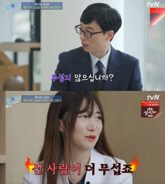 이날 유재석은 부검에 대해 이야기하던 중 "무섭지 않냐"라며 물었습니다. 이에 법의조사관 곽유진 씨는 "다 물어보시면 '악몽 꾼 적 있냐', '안 무섭냐' 이런 거 물어보신다. 한 번도 악몽을 꾼 적은 없다"라며 밝혔습니다.