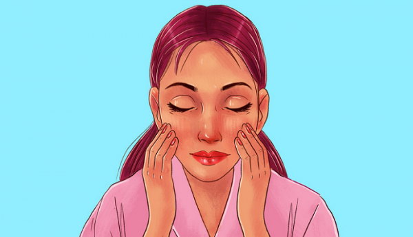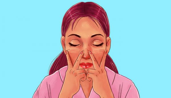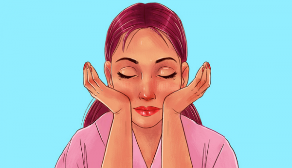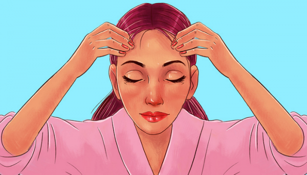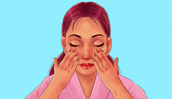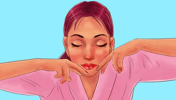 손바닥으로 광대뼈 아랫부분을 위로 누르고 머리를 양손에 떨어뜨린다. 10초 정도 뒤에 손바닥을 광대뼈 아랫부분에 놓고 둥글게 굴린다. 같은 동작을 6회 반복한다.
