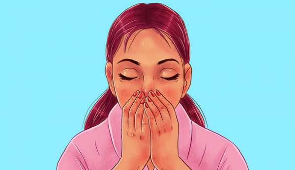 눈을 감고 손으로 얼굴을 가린 다음 천천히 손을 목으로 이동시킨다. 조급한 마음을 버리고 마음을 편안하게 하는 것이 중요하다.