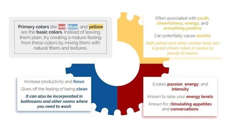 빨간색을 비롯한 파랑, 노랑 등의 색상을 기본 색상이라고 부른다. 그러나 이들로만 색을 대비하면 마치 유치원이나 놀이동산에 온 것같은 느낌을 받을 수 있다. 이에 자연 섬유나 질감있는 것들과 서로 혼합해 보다 성숙된 분위기를 창조하면 더욱 세련된 느낌을 조성할 수 있다.