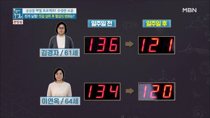실제로 젓갈이 혈압에 어떤 영향을 미치는지 실험을 진행한 결과를 알아보겠습니다. 고혈압 위험이 있는 두 실험자를 대상으로 일주일 동안 젓갈을 섭취하도록 했습니다.
