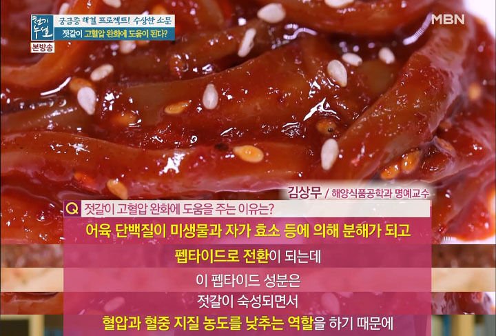 젓갈의 어육 단백질이 미생물과 자가 효소 등에 의해 분해되어 펩타이드로 전환되는데 이 성분은 혈압과 혈중 지질 농도를 낮추기 때문입니다.