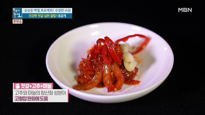 젓갈에 고추와 마늘을 넣어 먹으면 고추와 마늘의 항산화 성분이 고혈압 완화에 큰 도움이 됩니다. 그리고 젓갈에 들기름을 끼얹어 먹으면 펩타이드 흡수율을 높일 수 있다고 합니다. 추가적으로 배를 넣어 먹으면 배의 칼륨이 젓갈의 염분을 배출하는 데 도움을 준다고 합니다. 또한 배의 아삭아삭한 식감이 더해져 젓갈의 풍미도 풍부해집니다.