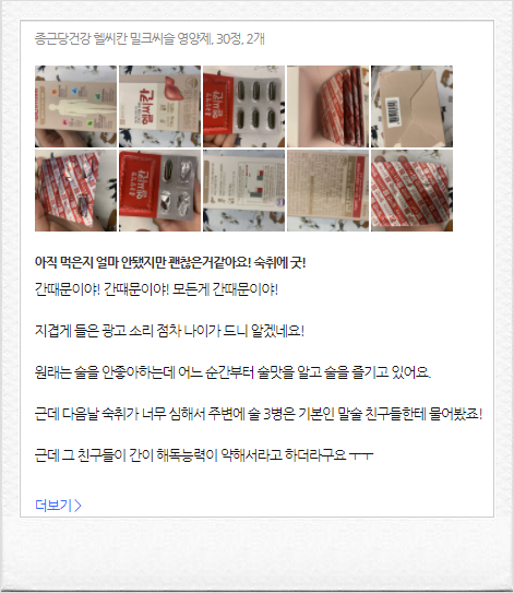 실리마린130mg을 함유하였으며, 활력 비타민인 비타민B군 식약처 1일 영양소 기준치 100% 충족합니다. 또한 항산화 작용을 하여 유해산소로부터 세포를 보호하는데 필요한 비타민E도 함유하였습니다.