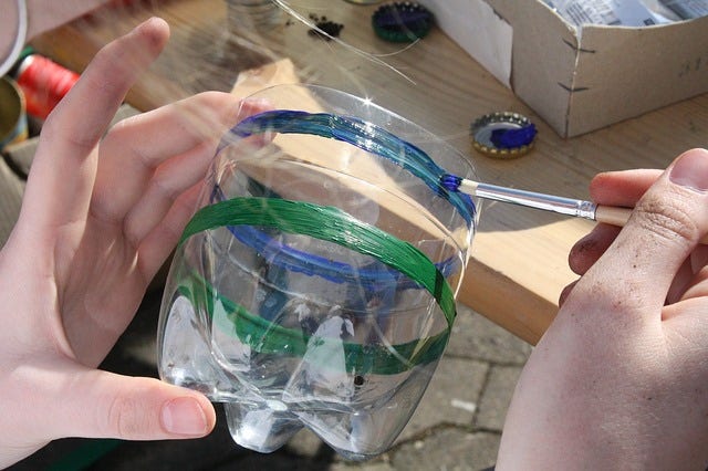 플라스틱 물병을 재활용할 수 있는 가장 창의적인 방법 중 하나는 예쁜 화분으로 만드는 것이다. 여기에는 1.5리터짜리 패트병, 물감, 붓 그리고 마커가 필요하다.