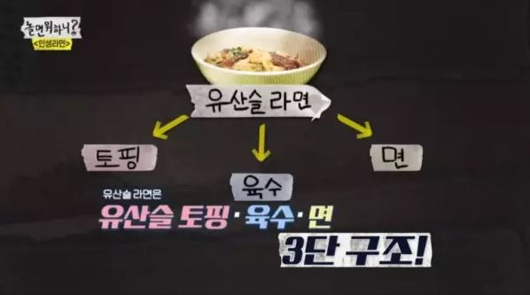 해당 방송분에서 유재석은 중식의 달인 여경래 셰프에게 배운 유산슬과 비슷한 재료로 라면을 만들었다. 유산슬 라면은 유산슬 토핑과 면, 육수의 3단 구조로 완성된다.
