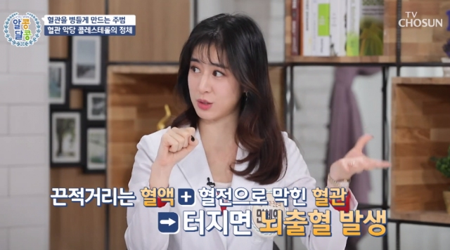 민혜연은 “콜레스테롤이 혈관에 과도하게 쌓여서 혈액을 응고시켜 혈관을 막는 원인”이라고 지적하며 “끈적거리는 혈액과 혈전으로 막힌 혈관이 터지면 뇌출혈이 발생한다. 혈관 문제의 주범이 콜레스테롤인 것”이라고 설명했다.