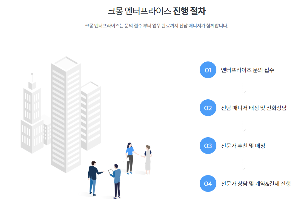 또 기업 눈높이에 맞는 전문성으로 개인 전문가 뿐만 아니라 전문 에이전시 기업형 프리랜서까지 만날 수 있습니다. 주 52시간 근무 대안으로 기업 구성원들이 핵심 역량에 집중하고 기업은 변화에 유연하게 대응할 수 있는 솔루션이 가능합니다.
