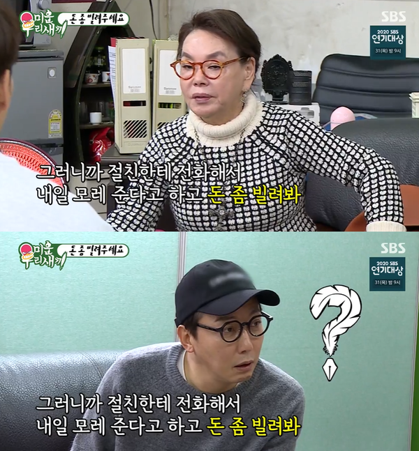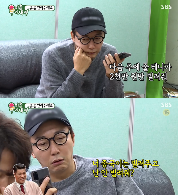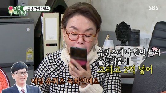 이에 김종국은 서장훈에게 전화를 걸어 5천만원을 빌려 달라고 부탁했다. 그러자 서장훈은 “돈이 갑자기 왜 필요하냐. 여자 생겼냐”고 놀라는 모습을 보였다. 고민하던 서장훈은 선뜻 내일 5천만원을 보내주겠다고 약속했다. 그러자 탁재훈은 바로 서장훈에게 전화를 걸었다. 탁재훈은 김수미의 만류에도 “진짜 돈을 빌리려고 한다”고 본심을 고백해 주위를 폭소케했다.