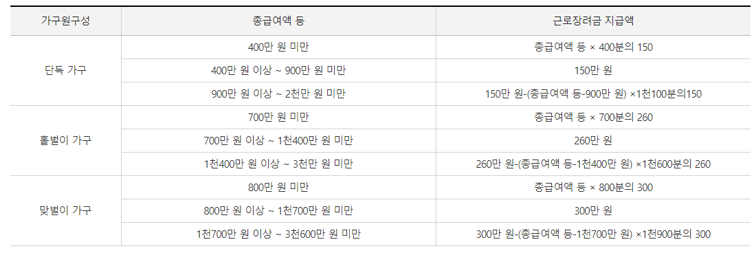 근로장려금은 가구원 구성에 따라 정한 부부합산 총급여액 등을 기준으로 지급액을 산정합니다.