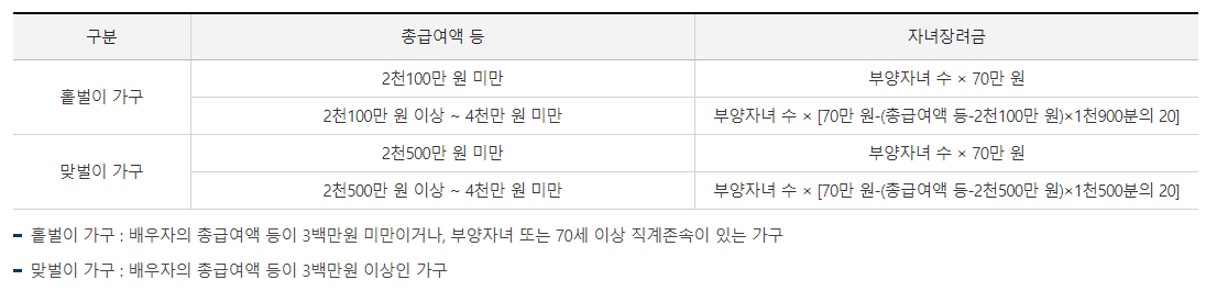 자녀장려금 소득요건은 홑벌이가구 연소득 4만~4000만원 미만, 맞벌이가구 600만~4000만원 미만입니다.
