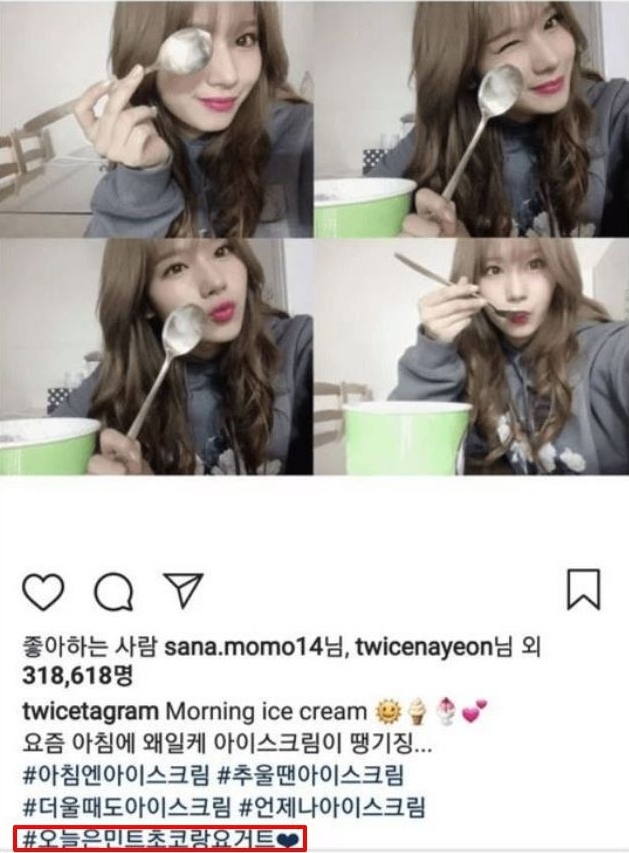 트와이스의 나연, 쯔위, 다현은 한 팬사인회에서 "민트 초코를 사랑한다. 초콜릿은 다 좋아한다"라고 말했다. 사나는 인스타그램에 "#아침부터 아이스크림, 오늘은 민트 초코랑 요거트♥"라고 테그하며 민트 초코를 먹는 사진을 올린 바 있다.