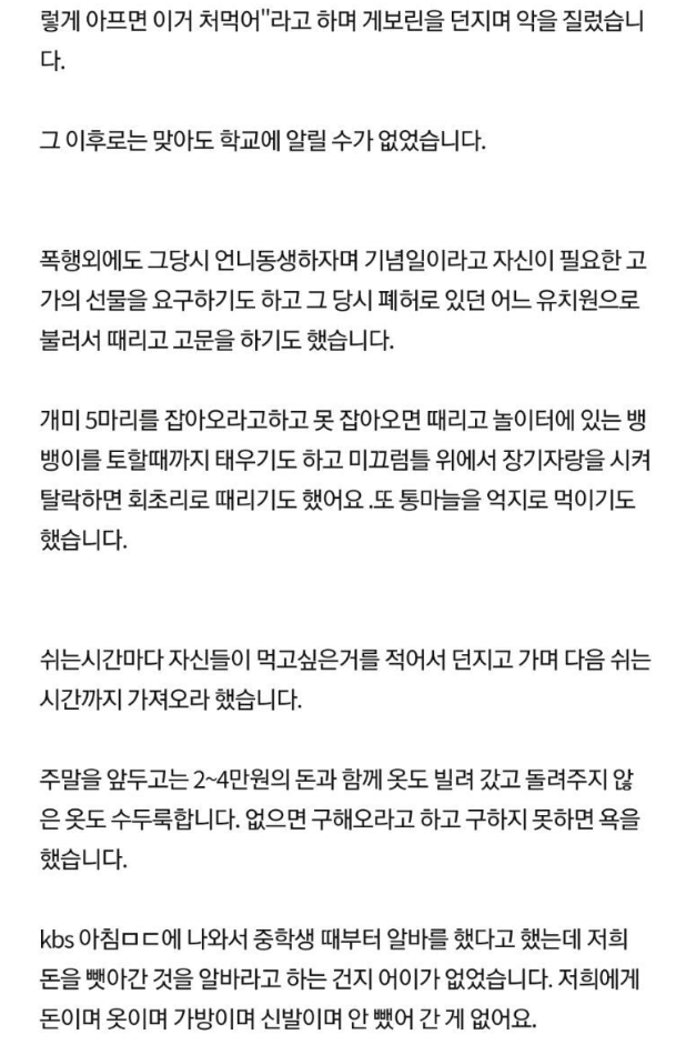 덧붙여 "(중략) 개미 5마리를 잡아오라고 하고 못 잡아오면 때리고 놀이터에 있는 뱅뱅이를 토할 때까지 태우기도 하고 미끄럼틀 위에서 장기자랑을 시켜 탈락하면 회초리로 때리기도 했어요. 또 통마늘을 억지로 먹이기도 했습니다"라고 말했습니다.