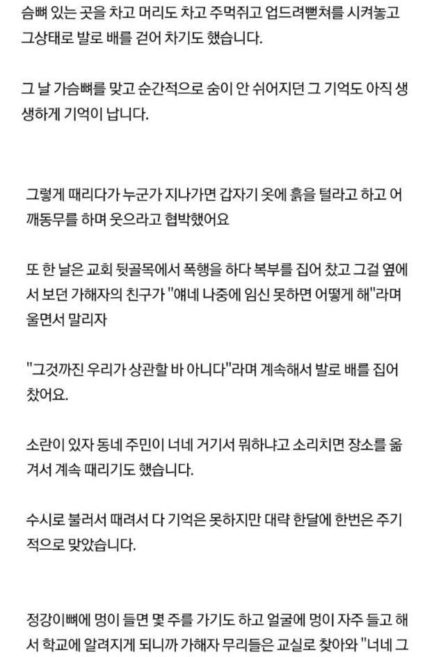 마지막으로 "(중략)이 글을 쓰는 20년이 지난 지금도 무섭고 두렵습니다. 그때 아무 말 못 하고 당하기만 하던 때와 크게 변하지 않은 상황과 달라진 게 없어서 너무 화가 나지만 가만히 있으면 화병이 날 것 같아 여기에라도 적어봅니다"라고 밝혔습니다.