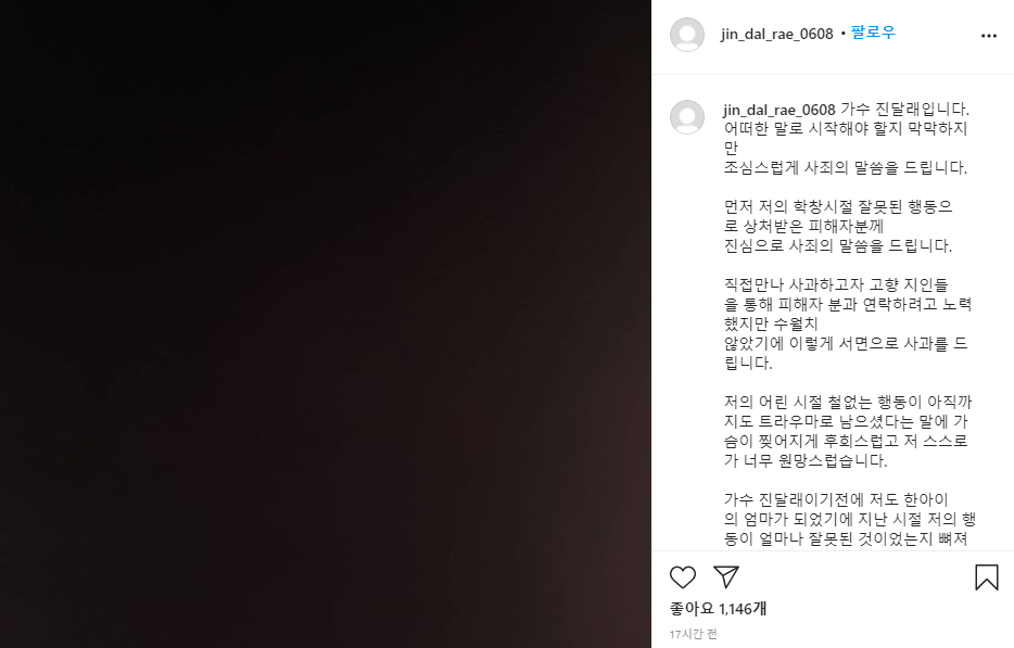 그녀는 "먼저 저의 학창 시절 잘못된 행동으로 상처받은 피해자분께 진심으로 사죄의 말씀을 드립니다."라며, "저의 어린 시절 철없는 행동이 아직까지도 트라우마로 남으셨다는 말에 가슴이 찢어지게 후회스럽고 저 스스로가 너무 원망스럽습니다"라고 밝혔습니다.