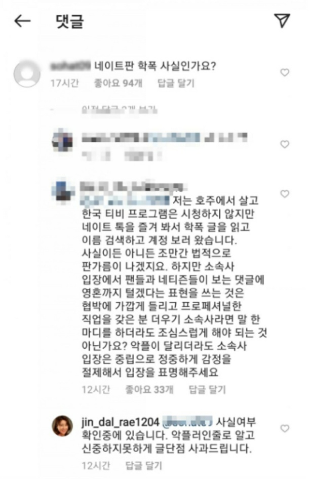 이에 소속사는 "사실 여부 확인 중에 있습니다. 악플러인 줄로 알고 신중하지 못하게 글 단 점 사과드립니다"라고 뒤늦게 사과의 댓글을 달았습니다.
