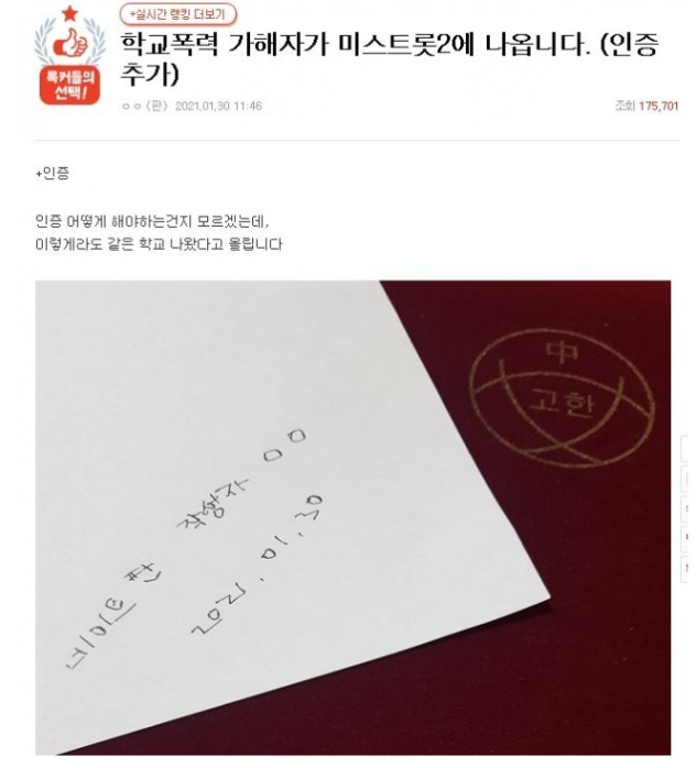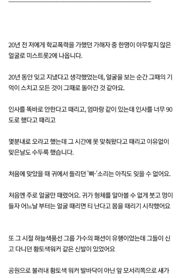 이 글의 글쓴이는 "20년 전 저에게 학교 폭력을 가했던 가해자 중 한 명이 아무렇지 않은 얼굴로 미스트롯 2에 나옵니다"라며 글을 시작했습니다.