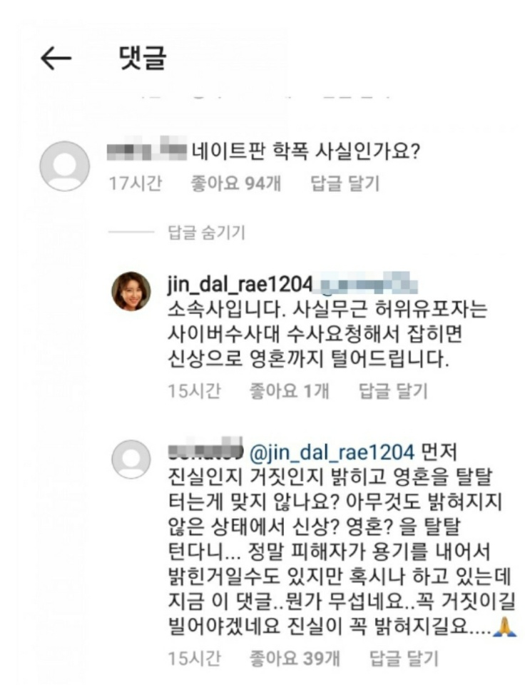 이를 본 다른 누리꾼은 "먼저 진실인지 거짓인지 밝히고 영혼을 탈탈 터는 게 맞지 않나요? 아무것도 밝혀지지 않은 상태에서 신상? 영혼? 을 탈탈 턴다니... 정말 피해자가 용기를 내어서 밝힌 거일 수도 있는데 지금 이 댓글... 뭔가 무섭네요... 꼭 거짓이길 빌어야겠네요. 진실이 꼭 밝혀지길요"라고 댓글을 달았습니다.