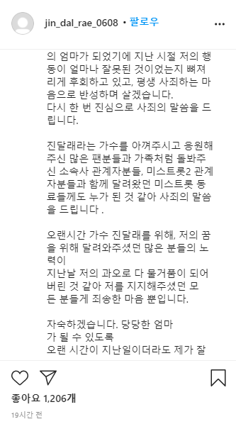 덧붙여 "가수 진달래이기 이전에 한 아이의 엄마가 되었기에 지난 시절 저의 행동이 얼마나 잘못된 것인지 뼈져리게 후회하고 있고, 평생 사죄하는 마음으로 반성하며 살겠습니다. (중략) 미스트롯 2 관계자분들과 함께 달려왔던 미스트롯 동료들께도 누가 된 것 같아 사죄의 말씀을 드립니다"라고 했습니다.