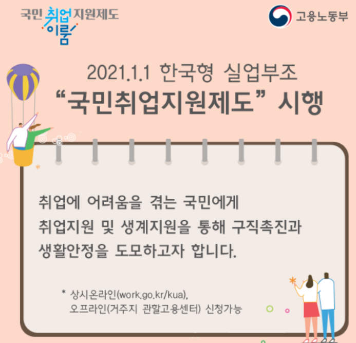 2021년 01월 01일 「구직자 취업촉진 및 생활안정지원에 관한 법률」에 근거한, 한국형 실업부조 국민취업지원제도가 시행됩니다.