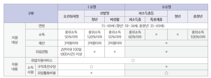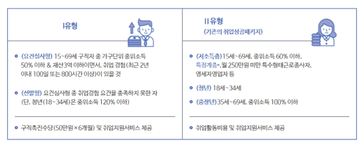 취업을 원하는 청년, 장기실업자, 경력단절여성, 저소득 구직자, 특수형태근로종사자 등 취업취약계층으로 인정되는 분들은 국민취업지원제도의 지원을 받으실 수 있습니다. 참여자 소득과 재산 등에 따라 두 가지 유형으로 지원하게 됩니다.