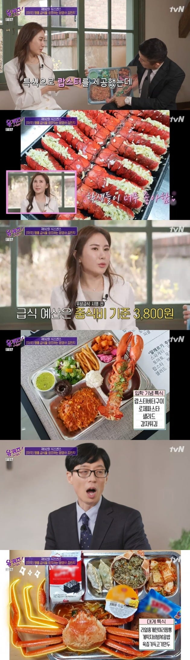 조세호는 과거 화제가 됐던 김민지 영양사가 만든 학교 급식을 소개했습니다. 식판에는 랍스터가 담겨있어 시선을 사로잡았다. 김민지 영양사는 "이벤트성으로 준비했는데 학생들 반응이 너무 좋았다. 1인 1랍스터였다"라며 "발품을 팔아서 돌아다녔다. 랍스터 한 마리당 5500원에 받아서, 아이들에게 공급했다"라고 말했습니다.