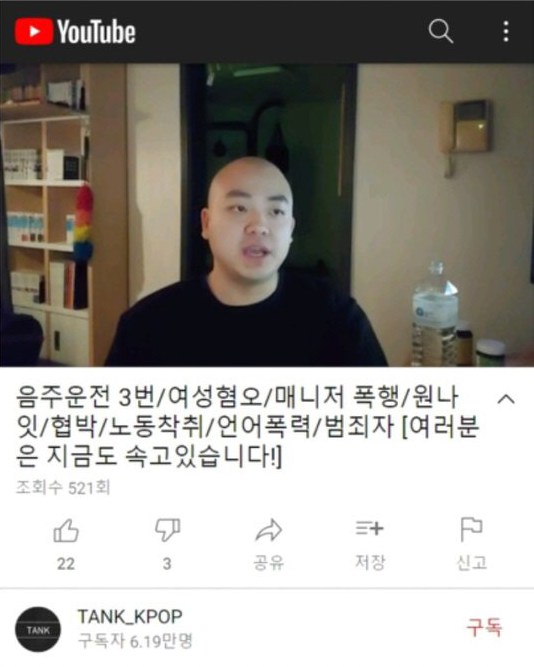 지난 17일, 프로듀서 탱크(본명 안진웅)가 자신의 유튜브 채널 탱크 케이팝에 "음주운전 3번/여성 혐오/매니저 폭행/원나잇/협박/노동착취/연어폭력/범죄자[여러분은 지금도 속고 있습니다!]"라는 제목의 글을 올려 화제가 되었습니다.