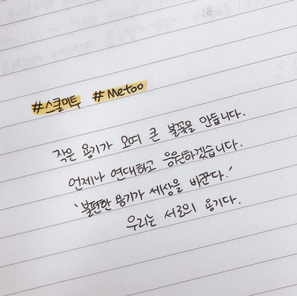 당시 이 학교 학생들은 교실 창문에 포스트잇으로 미투(Me, too), 위드유(With you) 등의 문구를 붙이며 교내에서 벌어진 성폭력을 고발했고, 이른바 '스쿨미투'가 시작됐죠.