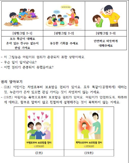 한 토의 활동 예를 보면 '어린이를 공평하게, 안전하게 대하는 방법은 무엇일까요'를 주제로 세 가지 상황을 그림으로 제시합니다. 한 원아가 다른 원아와 떨어져 노는 모습, 한 원아가 다른 원아에게 주먹을 휘두르는 모습 등을 제시하며 스스로 권리에 대해 생각해보는 활동을 하도록 한 것이에요.