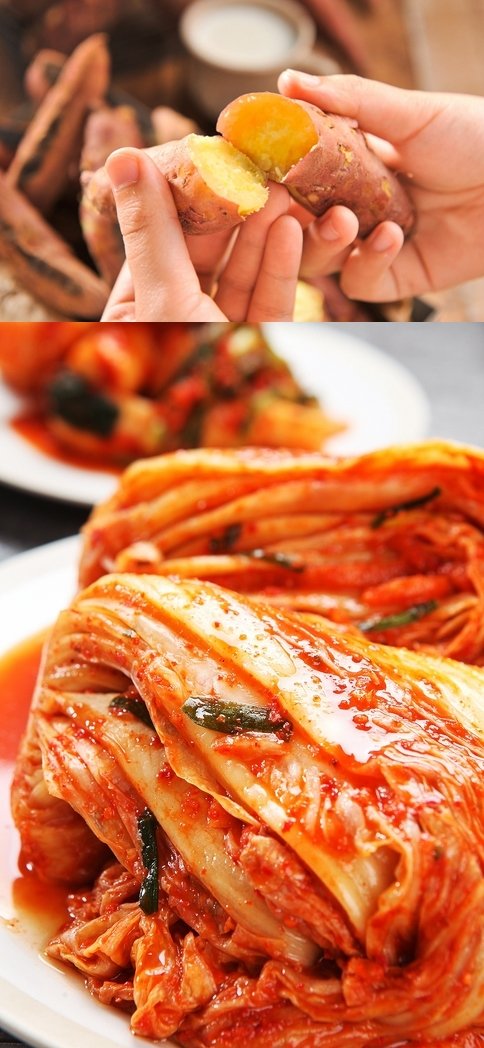 고구마와 함께 먹기 좋은 음식으로 김치를 빼놓으면 섭하죠. 고구마의 단맛이 물릴 때쯤 김치가 시원한 맛을 내면서 깔끔하게 맛의 균형을 잡아줍니다. 또한 칼륨 성분은 나트륨 성분을 배출하는 역할을 하는데, 고구마에 들어있는 칼륨이 김치에 들어있는 나트륨과 균형이 맞습니다. 더욱이 김치에 풍부한 유산균과 젖산균 등 영양까지 더해져 더할 나위 없는 궁합이죠.