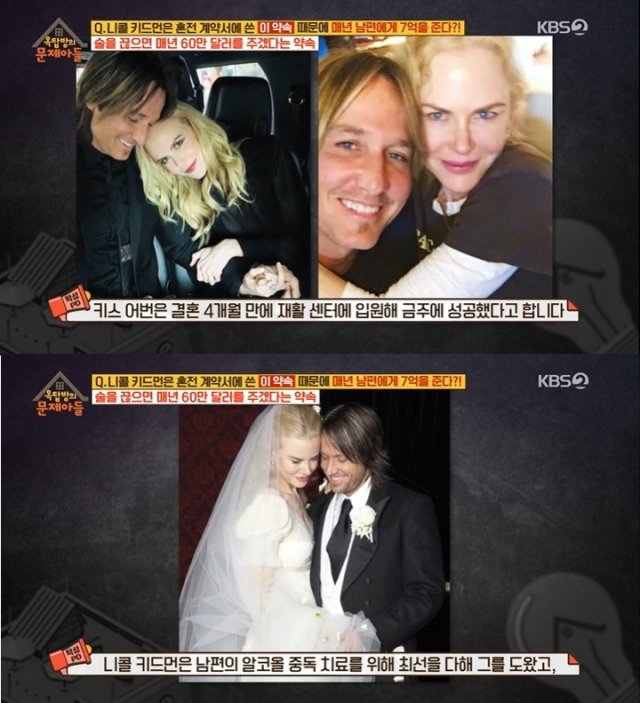제작진은 “술을 끊으면 매년 60만 달러를 주겠다는 약속”이라며 “2006년 결혼 당시 키스 어번은 알코올 중독으로 매우 힘든 상태였다. 니콜 키드먼은 남편의 알코올 중독 치료를 위해 최선을 다해 그를 도왔고 키스 어번은 결혼 4개월 만에 재활 센터에 입원해 금주에 성공했다고 한다”고 설명했다.