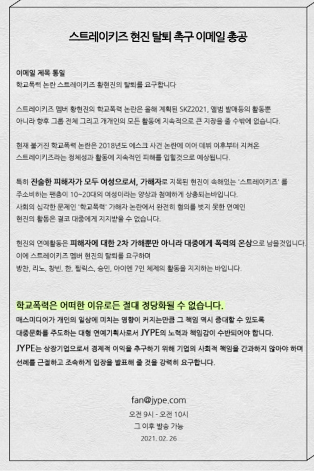 글쓴이는 또, "현진의 연예 활동은 피해자에 대한 2차 가해뿐만 아니라 대중에게 폭력의 온상으로 남을 것입니다. 이에 현진의 탈퇴를 요구하며, 방찬, 리노, 창빈, 한, 필릭스, 승민, 아이엔 7인 체제의 활동을 지지하는 바입니다"라고 밝혔습니다.