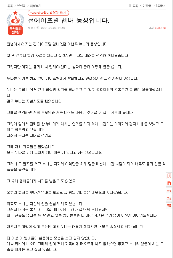 지난달 28일 한 온라인 커뮤니티에 올라간 글이 화제가 되면서 이러한 논란이 불거졌는데요. 5년 전 에이프릴에서 탈퇴한 멤버 이현주의 남동생이라는 글쓴이는 "누나가 팀 내 왕따를 당해 탈퇴했다. 연기를 위해 탈퇴한 것이라고 했지만 이것은 사실이 아니다"라고 말문을 열었습니다. 이어, "누나는 스트레스로 자살시도를 했고, 엄마와 누나가 소속사로 찾아갔지만 멤버들은 비웃으며 지나갔다"라고 주장했습니다. 또한 주민등록등본 캡처본까지 첨부하며 주장의 신빙성을 더했는데요.