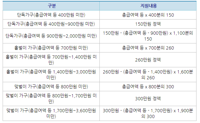 홑벌이 가구의 경우 배우자의 총 급여액 등이 300만 원 미만이거나 연 소득 1백만 원 이하의 부양자녀 또는 부양 부모가 있는 가구에 속합니다.