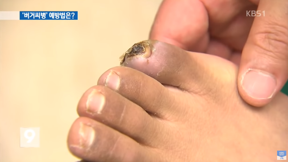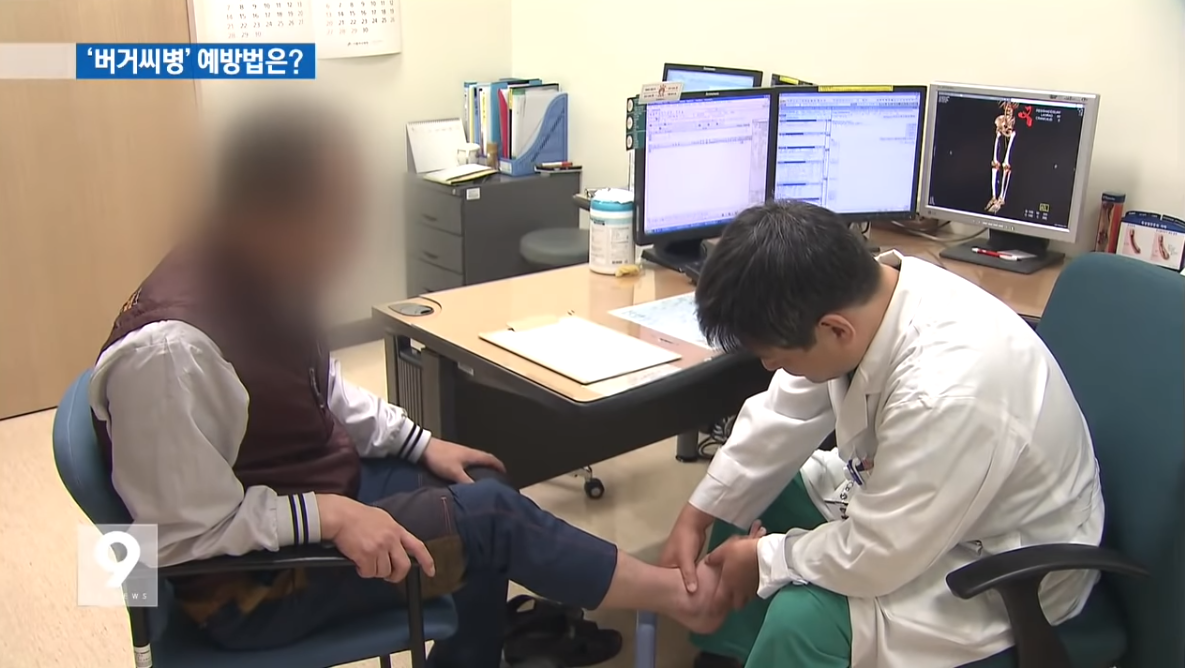 버거씨병은 주로 다리와 발의 작은 혈관들이 염증으로 인해 혈전이 형성돼 막히는 질환으로, 흡연이 이 질환의 발생에 가장 중요한 원인이에요. 버거씨병의 증상은 초기에는 운동 중에 발등이나 다리에 간헐적인 통증이 오게 되며 쉬면 곧 괜찮아집니다. 차가운 공기나 물에 노출됐을 때 통증이 오며 이러한 초기 증상 이후 계속 병이 진행되면 피부색이 청색으로 변하고 발열감이나 따끔따끔 거리면서 얼얼한 느낌도 생기게 됩니다. 때때로 발가락이나 손가락 끝에 통증을 수반하는 궤양이 생기기도 하는데, 심할 경우 괴사 상태에 이르러 조직의 절단까지 일어날 수 있죠.