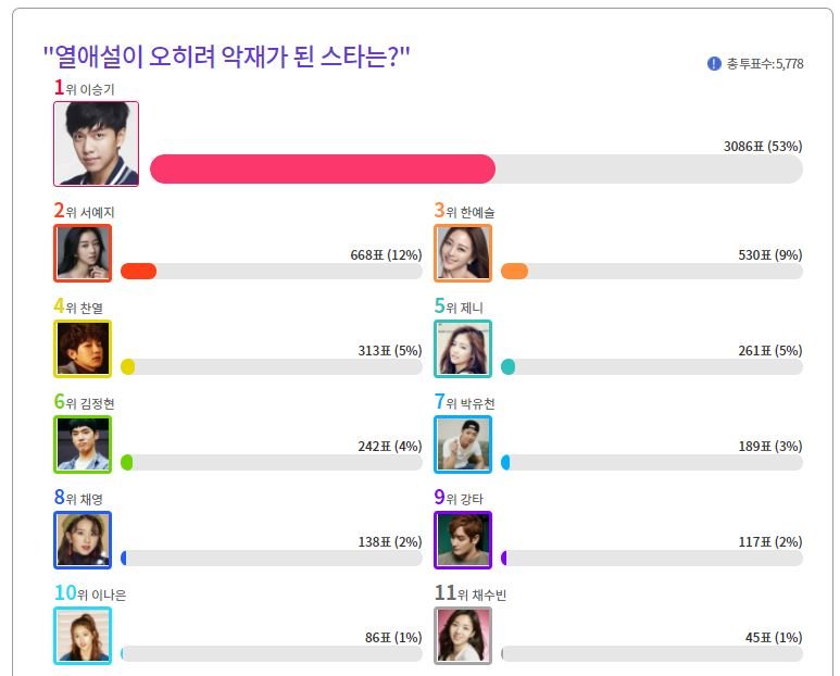 커뮤니티 포털사이트 디시인사이드와 취향 검색 기업 마이셀럽스가 운영 중인 ‘익사이팅디시’는 지난 5월 30일부터 6월 5일까지 총 7일간 ‘열애설이 오히려 악재가 된 스타는?’으로 투표를 진행했습니다.