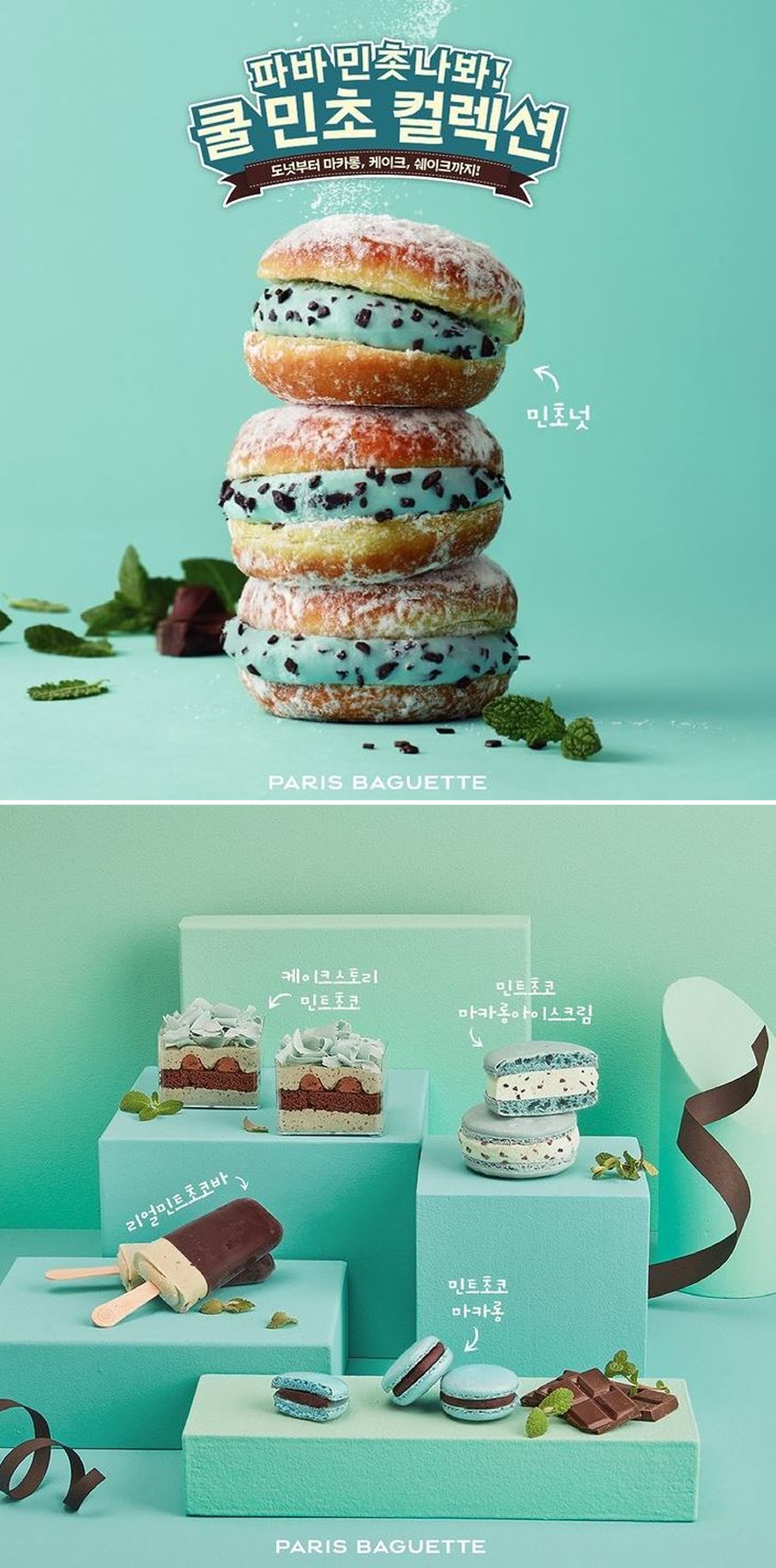 파리바게뜨에서 민초단을 겨냥한 민트 초코 디저트 메뉴들을 새롭게 선보였다. 케이크, 도넛, 아이스크림, 마카롱 등 여러 가지 디저트로 민트 초코의 맛에 빠져들 수 있다.