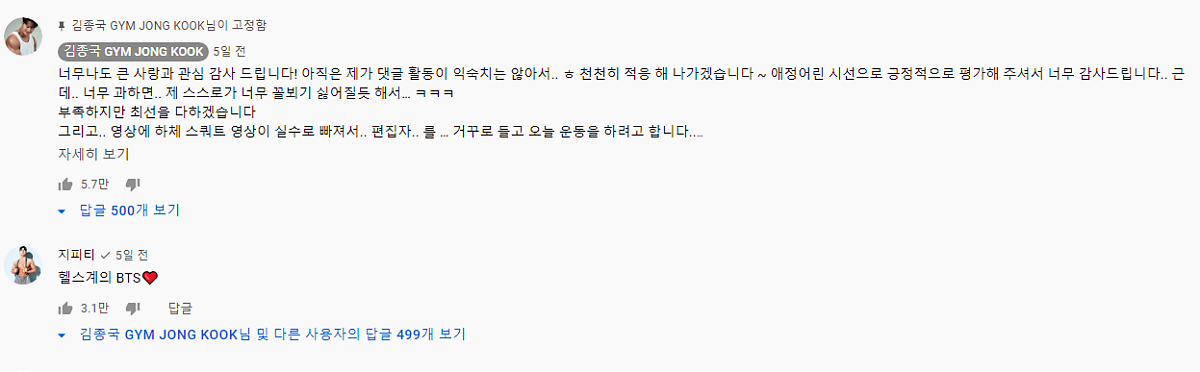 첫 번째 영상에는 본격적으로 김종국이 유튜브를 시작하는 인사와 함께 짤막한 운동 장면을 선보였다. 이후 조회수 650만 뷰를 훌쩍 넘으며 김종국은 유튜브 댓글을 통해 “너무나도 큰 관심과 사랑 감사드린다”며 “애정 어린 시선으로 긍정적으로 평가해주셔서 감사드리고 부족하지만 최선을 다하겠다”고 소감을 남겼다.
