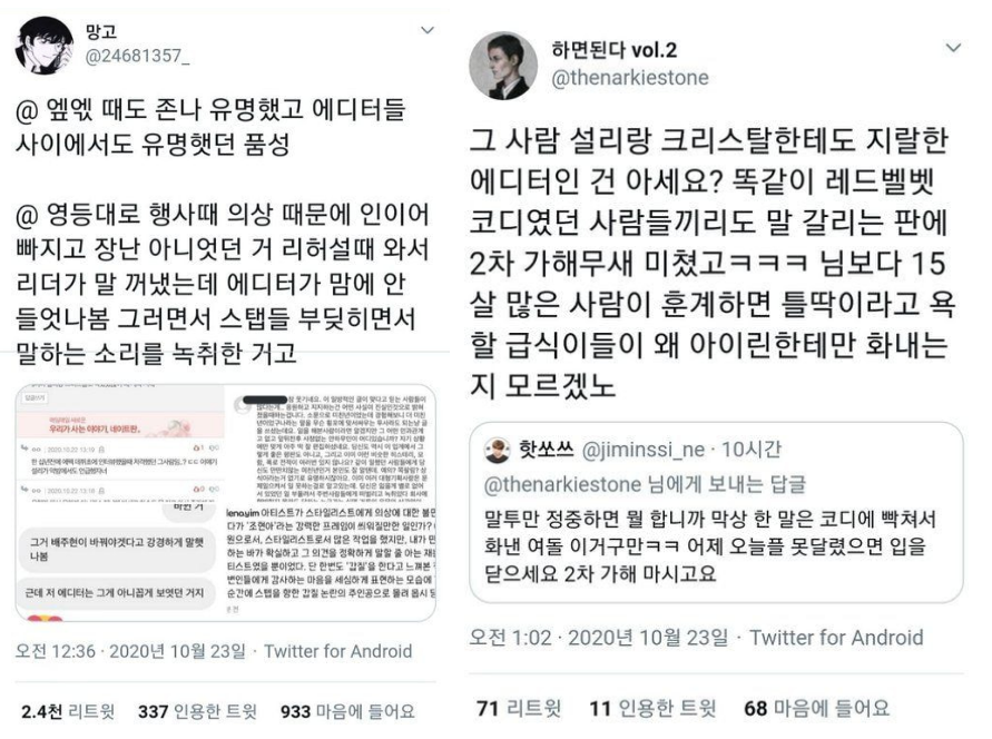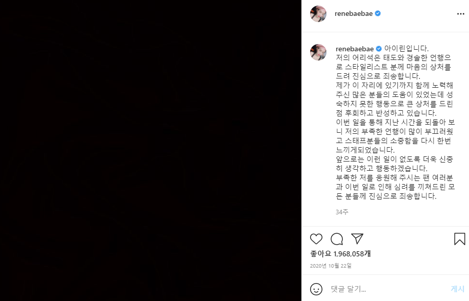 시간이 지나면서 추가 폭로가 이어지자 아이린은 "저의 어리석은 태도와 경홀한 언행으로 스타일리스트 분께 마음의 상처를 드려 진심으로 죄송합니다"며 "앞으로는 이런 일이 없도록 더욱 신중히 생각하고 행동하겠다"고 사과했다.