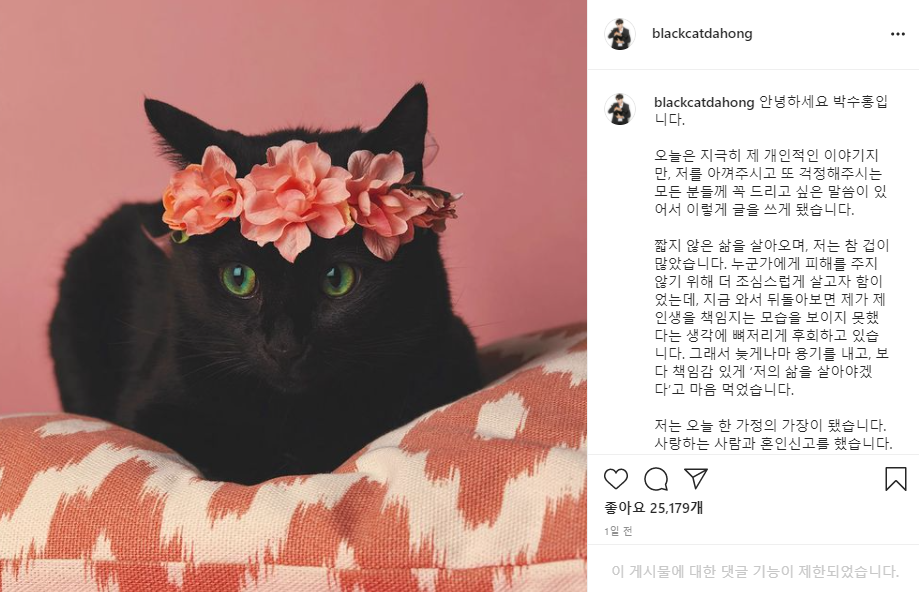 이어 "저는 그동안 너무 많이 참고 주체적으로 살지 못했다. 나 하나만 버티면 모든 상황이 나아질 거라 생각했기 때문"이라며 "하지만 세상은 그렇게 흘러가지 않는다는 것을 뒤늦게나마 깨달았다. 그래서 이제는 가장으로서, 남편으로서, 제게 삶의 희망을 준 다홍이(박수홍의 고양이)의 아빠로서 우리 가정을 위해 살고, 평범한 가족을 꾸리려 한다"고 말했다.