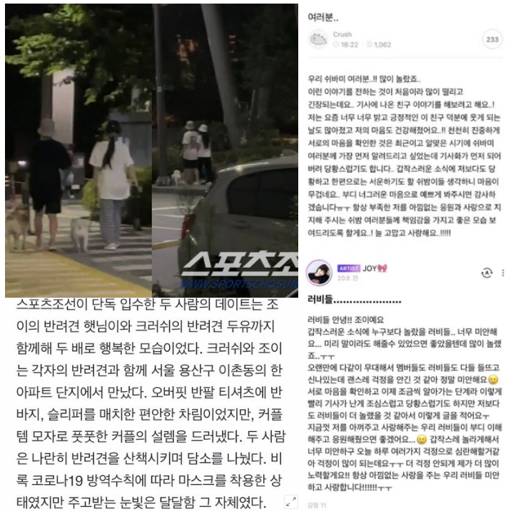 조이와 크러쉬의 열애가 인정하는 게시글에는 "마장ㅋㅋㅋㅋ크러쉬 당황해서 바로 방송중이라고 말하드라 둘이 잘 어울려(조이랑 크러쉬)", "사귄지는 얼마 안된것같고 썸?탄듯 마음 확인한지 얼마 안지났다고 했으니깡", "ㅋㅋㅋㅋㅋㅋㅋㅋㅋㅋ솔직히 최근에 사귄 거였으면 사귄 지 얼마 안돼서 기사 냈을 리가 없음 연애한 지 꽤 됐고 계속 갈 것 같다는 확신이 있어야 기사 내지 암튼 잘 만났으면 좋겠당" 등의 댓글이 올라왔다.