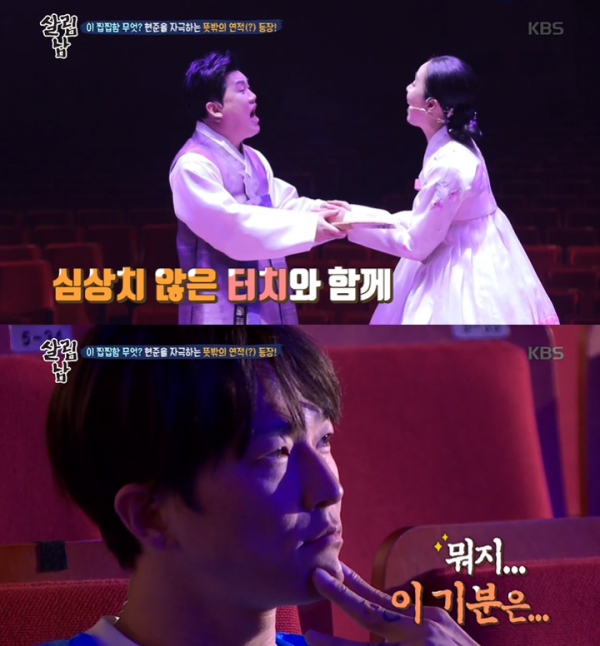 이후 박애리와 남상일은 ‘사랑가’ 녹화 공연에 올랐다. 팝핀현준은 객석에서 이를 지켜봤다. 하지만 두 사람이 손을 마주 잡는 연기에 돌입하자 팝핀현준은 얼굴에 불쾌감을 드러내 보는 이들을 폭소하게 했다.
