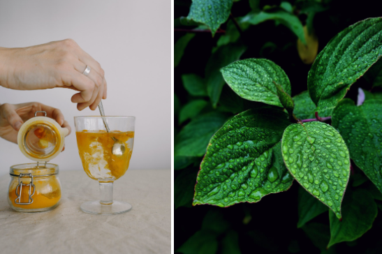 강황은 건강과 피부에 유익한 것으로 알려져 있다. 강황에 함유된 커큐민은 천연 항균제로 모공에 있는 박테리아를 제거한다. 그리고 항염 작용과 항산화 속성이 있어 피부 상태를 개선한다. 민트주스는 피부에 수분을 더해준다.