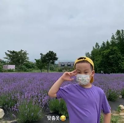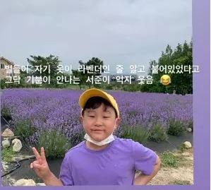14일 문정원은 자신의 인스타그램을 통해 "맞춤옴. 벌들이 자기 옷이 라벤더인줄알고 붙어있었다고. 그닥 기분이 안나는 서준이 웃음"이라는 글과 함께 사진을 게재했다.
